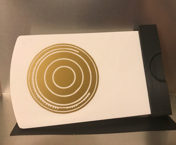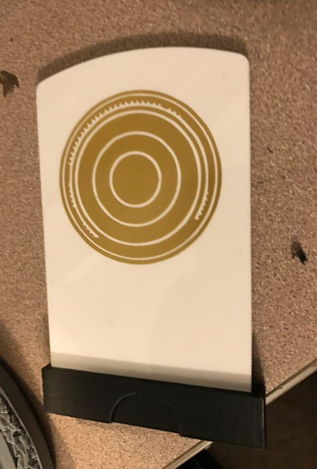 Another quick one day build that I did from Rogue One. This was the Death Star data card seen toward the end of the movie and also seen in the first bits of A New Hope. This was a laser cut acrylic card that was done on my local laser cutter, the gold vinyl was designed and cut on my personal cutter and I designed the black tab in Autodesk123d before 3d printing it!